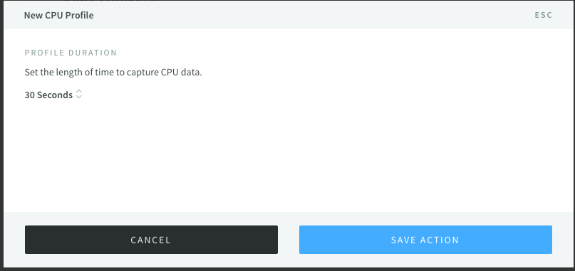 After selecting the CPU Profiling option in the Actions drop-down menu, a modal will open, there you can inform how much time you want the trace runs when the saved view has been triggered.