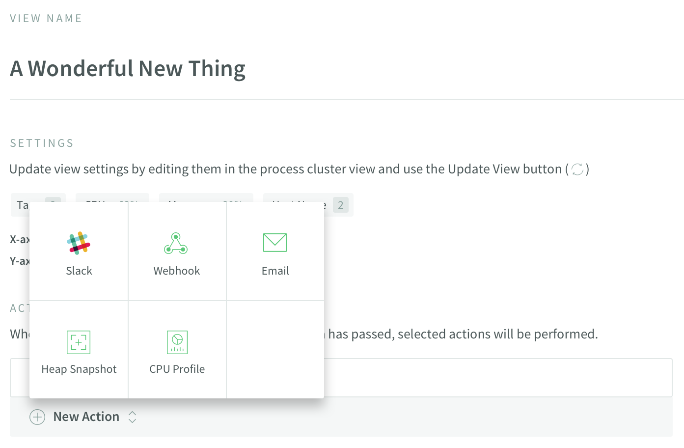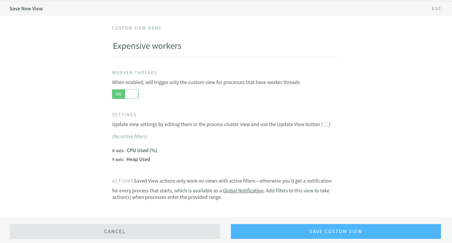A Saved View is a graph defined by a search query. Saved views allow you to view processes that fulfill certain parameters and to instruct N|Solid to take certain actions (such as taking heap snapshots, CPU profiles, or sending webhooks) when one or more processes cross over performance thresholds or match query parameters that you set.