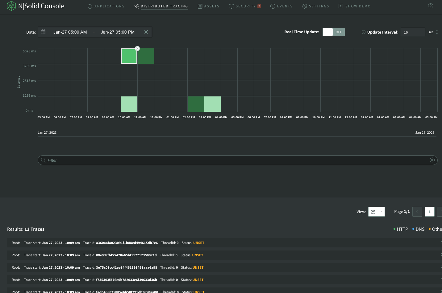 Performance problems often occur in production code non-deterministically, and often the only diagnostics available are an error log or possibly a stack trace. With N|Solid's saved views, you can automatically capture critical information when problems arise in production.