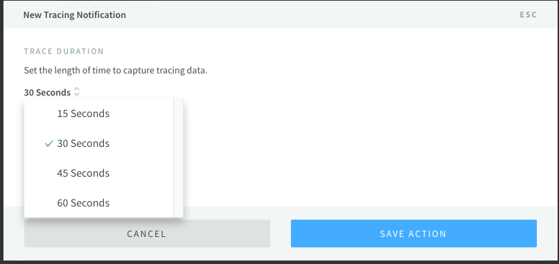 After selecting the Trace or CPU Profiling option in the Actions drop-down menu, a modal will open, there you can inform how much time you want the trace runs when the saved view has been triggered.