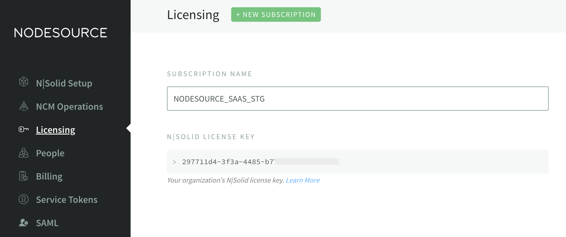 The N|Solid SaaS Dashboard offers a user interface for you to connect and configure your N|Solid SaaS Console. You can use it to manage people, billing, service tokens and more.