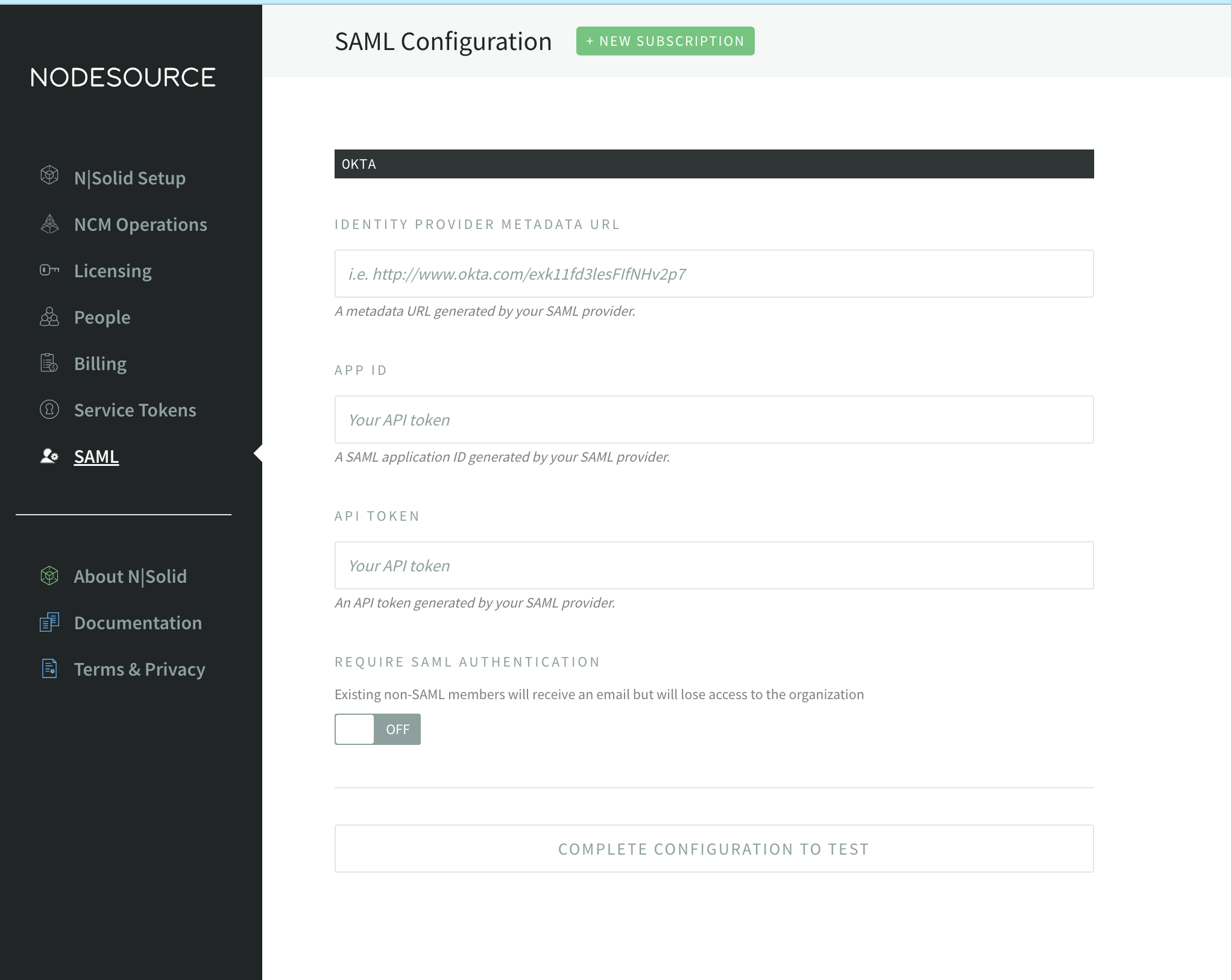 SAML (Security Assertion Markup Language) is an open standard for exchanging authentication and authorization data between an identity provider and a service provider which can be used for SSO (Single Sign-on) for the NodeSource Account.